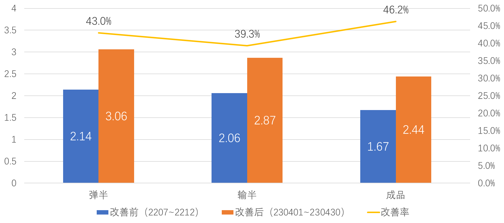 2.量化指标实现如下:物流距离缩短30.4%,人均效率提高42.8%,线内不良率降低83.1%。